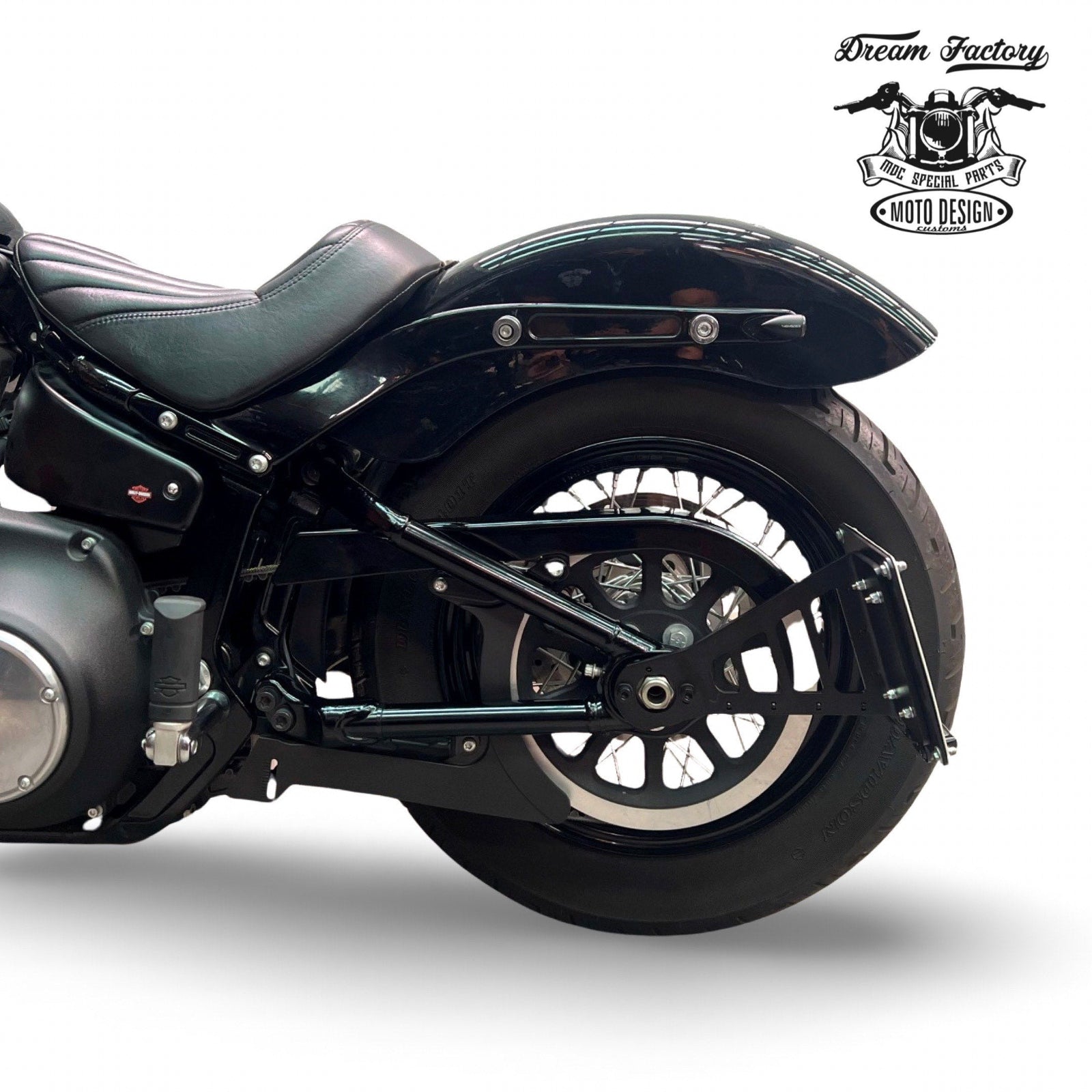 Handcrafted entirely in the MDC workshops from the finest steel alloys and finished with a high-strength black finish, this side-mounted license plate holder is designed for durability and style. It is compatible with a wide range of Softail M8 models, including the Fat Boy, Heritage Classic, Deluxe, Breakout, Softail Slim, Low Rider, Sport Glide, and Street Bob, spanning 2018 through the latest models. Perfect for those seeking a rugged, stylish accessory, it enhances the aesthetics of the bike without compromising functionality. Note : License plate light is not included and must be purchased separately.