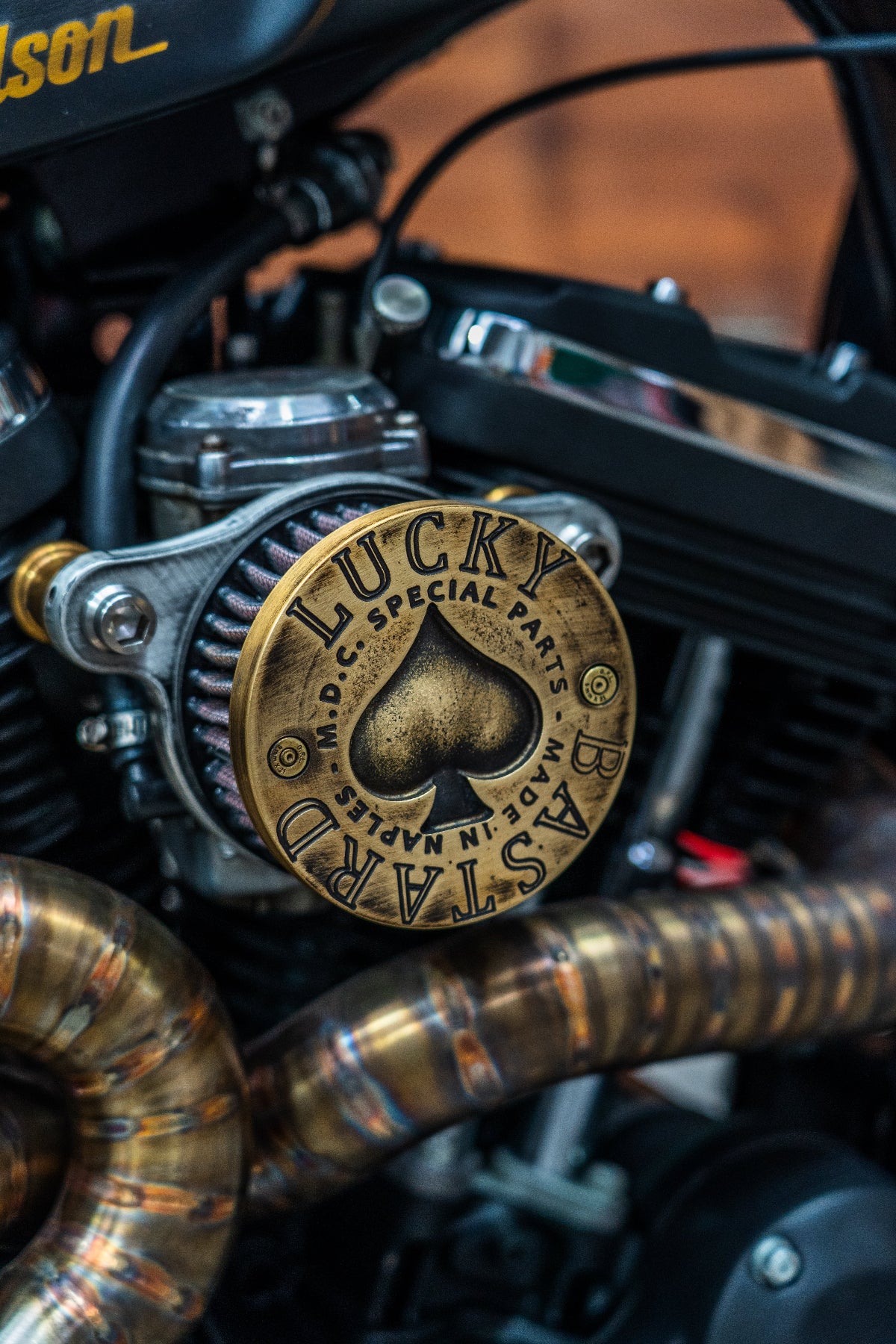 The Lucky Bastard Air Filter, compatible with Sportster models from 1991 to 2020, is a high-precision product manufactured entirely in our MDC workshops using advanced CNC and die-casting techniques. The poker-inspired design combines aesthetics and functionality. The complete kit includes breather plates and support, spacer bushings, drilled fittings, multiple gaskets, mounting pins, a premium K&N filter element, and the distinctive Lucky Bastard cover. Available in two finishes—brass and burnished—it guarantees a perfect fit and optimal efficiency. Remember to specify your motorcycle year and model when ordering for precise compatibility.