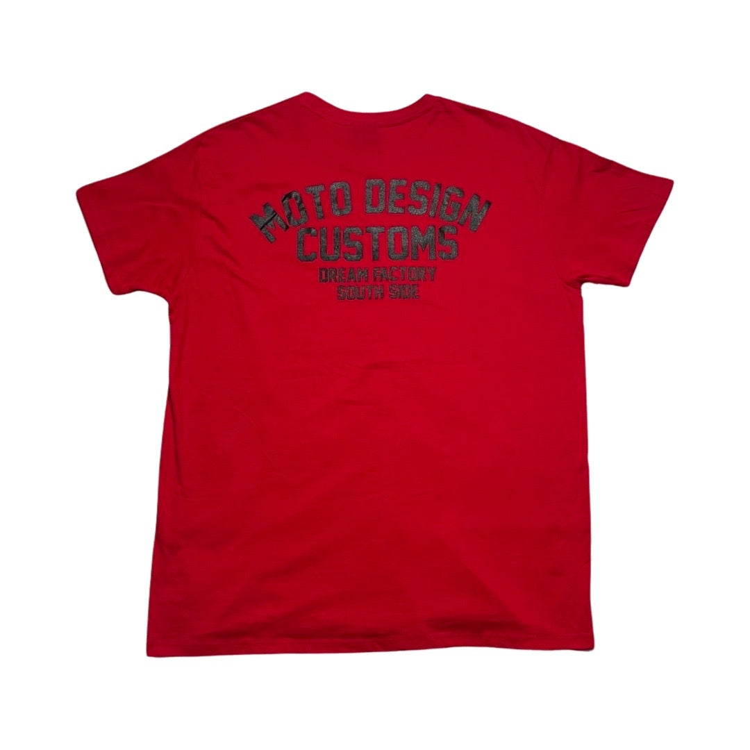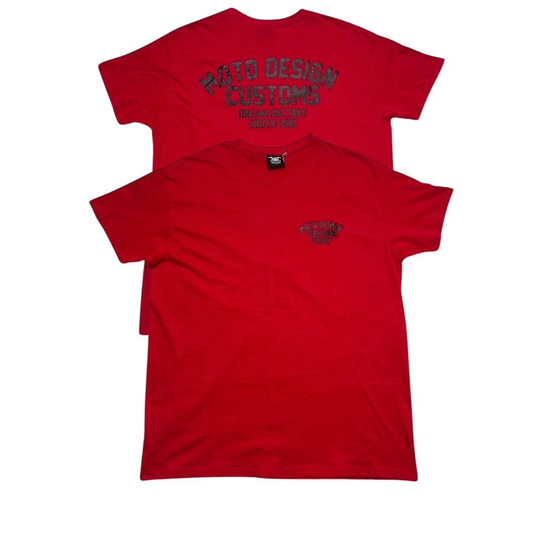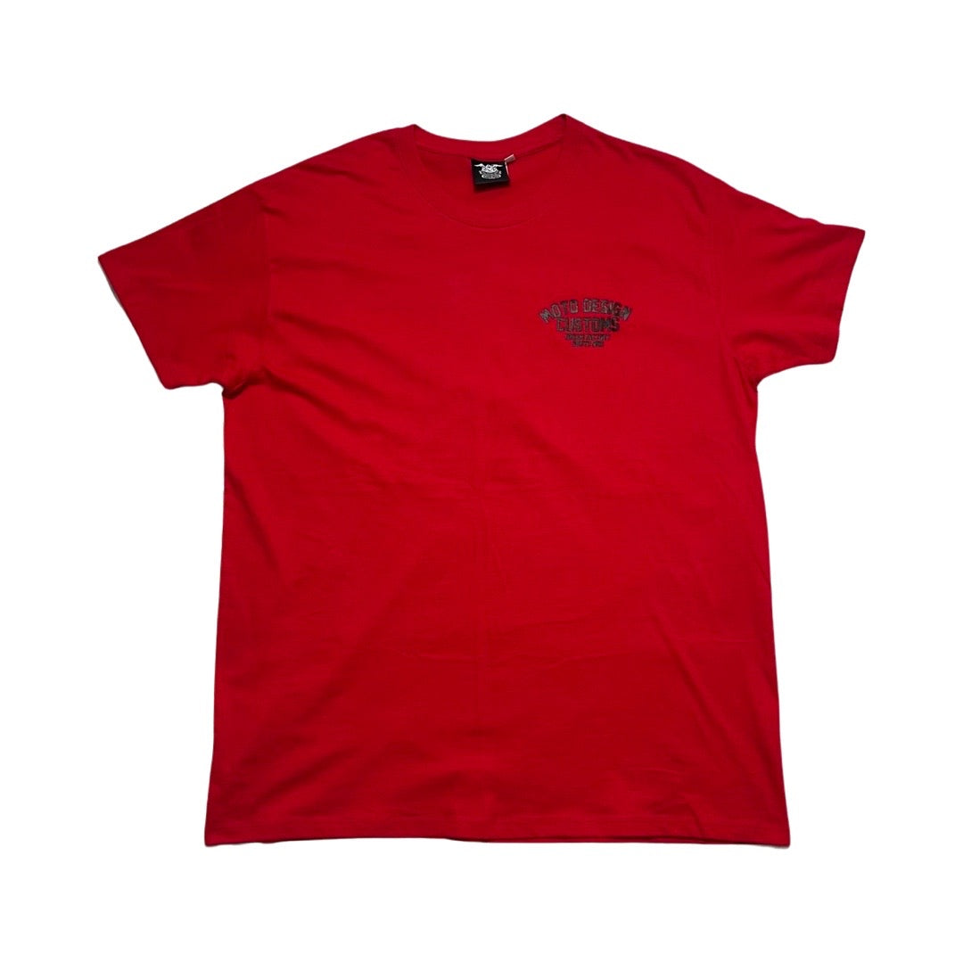 Red T-shirt, made of cotton, with a simple design with short sleeves and a classic fit. A small print with the words "Moto Design Customs" on the left chest, as well as on the back, adds a distinctive touch.